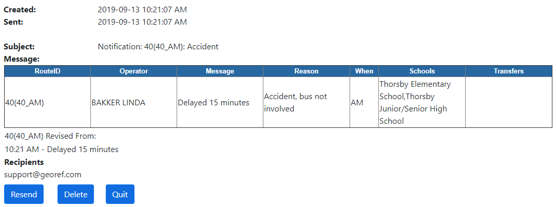 •Resend – Forces BusPlanner Web to resend the message to the email addresses listed in the Recipients list. •Quit – Stops the message from trying to resend itself. Can be useful if the message is continually failing. |